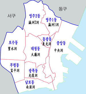 • 1957년 1월 1일 경상남도 부산시 중구가 설치되었다. (10행정동)[3]